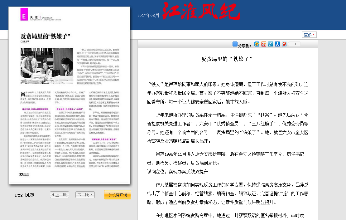 丹心书高洁,兰心胜须眉。 17年来吕萍所办理的反贪案件无一错案,都办成了一件件“铁案”。其突出的办案功绩也得到了组织的认可,先后荣获“全省查办司法不公背后职务犯罪专项行动先进个人”、“全省检察机关先进工作者”、六安市检察“理论研究人才”、六安市检察“优秀女性人才”、六安市“三八”红旗手、六安市“优秀侦查员”等称号,并被金安区委、区政府授予个人三等功和先进个人、优秀公务员等荣誉。